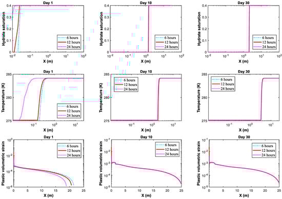 Figure 11 shows the one-dimensional distribution of temperature, hydrate saturation, and plastic volumetric strain along x = 0 m. Thus, the changes in relevant variables at various depths can be quantified. As in Figure 4, a smaller z value indicates a greater depth. Compared with temperature and hydrate saturation curves in Figure 10, it can be observed that the distances temperature drop fronts and hydrate dissociation fronts travel at specific time steps are similar in x and z directions, which corresponds to the circumferential patterns in Figure 6 and Figure 7. The gravity effects on temperature and hydrate saturation are not significant. However, the plastic volumetric strain curves in the z direction are different from those in the x direction. On days one and five, plastic volumetric strain values tend to be greater at shallower depths. This is affected by gravity, as areas above the horizontal wellbore have greater pressure depletion while areas below the wellbore have weaker pressure depletion. Based on poromechanical relationships, smaller pressure changes correspond to weaker mechanical responses. In addition, in the z direction, plastic deformations are not as extensive as those in the x direction.