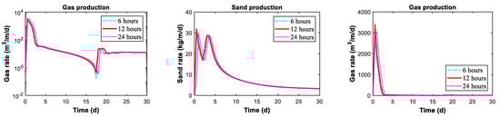 In Figure 18, it is noted that although the effect of time to reach depressurization is significant on the first day, its effect on the gas and sand production curves can be affected in a prolonged manner. The peak gas production rate in the 24 h scenario is reached slower than the other two scenarios, as the highest gas production rate is usually obtained after the establishment of the depressurization process. It is also noted that the 6 h scenario has the most significant gas rate drop after 17 days, as the 6 h depressurization strategy has the strongest early-stage hydrocarbon drainage. The sand production curves indicate that, while the overall sand production profiles are shifted by the time to establish depressurization, the oscillatory patterns and ranges of sand rates are very close. Therefore, although the effect of time to reach the depressurization pressure can be quantified by the sand rate curves, its effect on the magnitude of sand production is relatively limited.