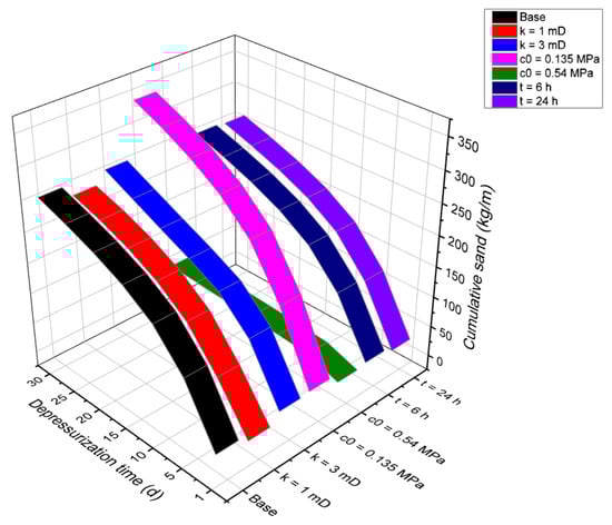 Results in the base case and sensitivity analyses quantify the coupled THMC behaviors and gas and sand production performance during the depressurization in methane-hydrate bearing sediments. Based on the quantitative analysis, the THMC responses and production behaviors are usually not simply monotonical and they are jointly affected by multiple physical fields. To better present the sensitivity, Figure 19 and Figure 20 are plotted to correlate the investigated parameters with cumulative sand production and cumulative gas production at certain discrete depressurization time steps. Cumulative sand production is not very sensitive to permeability or time to reach the depressurization pressure, as these two parameters directly govern pressure depletion and thermodynamic processes which are not tightly coupled with geomechanical responses including the failure and sand erosion. In contrast, sand production is highly sensitive to cohesion, as it directly controls the yield criterion in Mohr–Coulomb and Drucker–Prager models. Based on the same logic, cumulative gas production is sensitive to permeability and time to reach the depressurization pressure, while it is very insensitive to cohesion. This is because the geomechanical behaviors are induced by depressurization, and the evolution in the geomechanical field does not significantly affect the fluid flow in porous media in return.