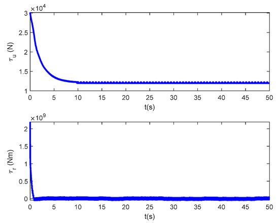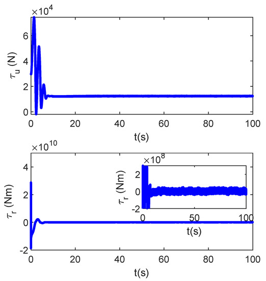 where denotes surge velocity, denotes sway velocity, and denotes yaw rate. denotes the ship inertia including added mass. , , , , and, denote hydrodynamic damping. , , and denote external disturbances. and denote surge force and yaw moment [21,38].