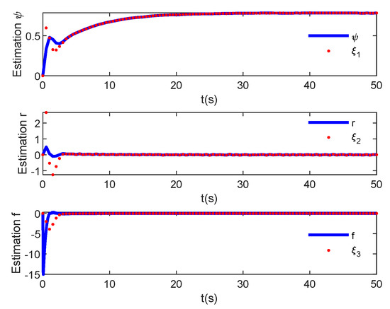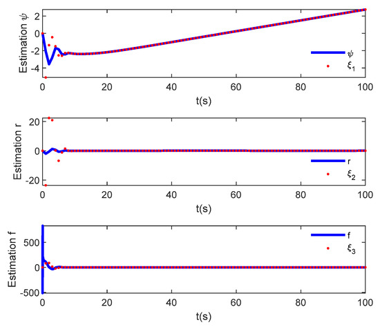 The performance of the event-triggered-based sliding mode controller for curved path following is investigated. In Figure 5, the red line is the reference signal; the guidance system is established based LOS method, and the guidance path is given by the green dot. The blue dot is the ship route of path following. Figure 5 shows that the ship can follow the desired path as closely as possible. Figure 6 shows the surge force and yaw moment, respectively. Figure 7 shows the estimation with ESO. It can be seen that the states and dynamics can be estimated by the presented ESO, and the curved path following of the underactuated ship can be achieved by the presented even-triggered sliding mode controller with ESO.