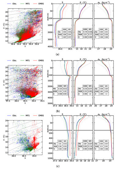 In this final part of the validation process, the vertical structure of the water column is compared to observations and state-of-the-art modeling systems. The comparison shows good agreement with observations, and the variability is reproduced accurately overall. In general, the EMBS simulation overestimates both salinity and temperature systematically over the whole column almost everywhere, nevertheless biases and RMSEs remain fairly low, with a very high correlation coefficient. While the MFS simulation (which makes use of these observations among others, as inputs for its assimilation scheme) reproduces the observations better than the EMBS simulation, the differences are very small. Moreover, in the area of our immediate interest (i.e., the north Aegean Sea), the performance of the EMBS simulation is comparable to the MFS operational forecasting system, especially reproducing vertical structures of the water column and density ranges (Figure 14). As can be seen in the figure, salinity in the north Aegean has a bias of 0.12 and an RMSE of 0.253, and potential temperature has a bias of 0.32 °C and an RMSE of 0.62 °C. Potential density has a bias of 0.017, and an RMSE of 0.169, while the improvement is even higher at the surface layers for all fields. Apart from the mean profiles, points from all the individual profiles in the entire set can be seen in the diagram, which shows a satisfactory reproduction of the water characteristics of the area in a three-dimensional sense.