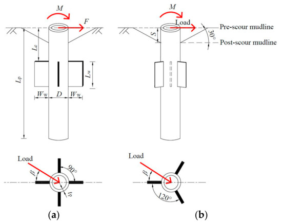 Effect of wing load orientation on the load capacity of winged monopiles: (a) a four-wing monopile; and (b) a three-wing monopile.