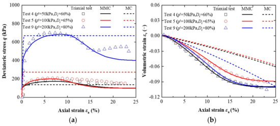 Figure 5a shows the stress–strain behavior of Fontainebleau sand captured by MC and MMC, respectively, against the drained triaxial compression test from Latini and Zania [46]. It shows that the MMC model can accurately capture the hardening and softening effects during the deformation of dense sand. For the MC model, the shear stress of the dense sand increases with the axial strain εa to the peak and then remains constant because a fixed friction angle is used in the analysis. As for Test 9 with a high relative density of Dr = 80%, the hardening and softening effects during the deformation of sand are salient, while the MC model is only capable of capturing the peak stress in the plastic zone. It is indicated that the MC model overestimates the load capacity of dense sand. Figure 5b compares the volumetric properties of the dense sand described by the MMC and MC models. By adopting the MMC model, the volumetric compression occurs initially, then the sand dilates until the volume approximately remains constant. In contrast, the MC model shows that dense sand dilates almost linearly after volumetric compression due to a fixed dilation angle ψ, deviating from the test results obviously.
