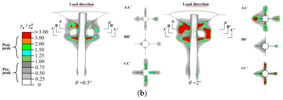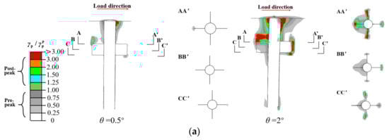 The effect of scour on soil–pile interaction can be further explained by the evolution of the plastic zone in dense sand. In Figure 10, indicates that the soil is in the post-peak region; conversely, the soil is in the pre-peak region when this condition is not met. As shown in Figure 10a, the soil in front of the pile head first enters the post-peak softening zone (θ = 0.5°) and gradually evolves downward with increasing rotation (θ = 2°). The plastic zone around the wing is mainly gathered above the rear wing and ahead of the front wing (θ = 2°). However, in Figure 10b, a large volume of soil is in the post-peak softening stage when the pile head displacement is small (θ = 0.5°). Nearly all of the soil around the wings enters the plastic zone after the formation of the local scour hole (θ = 2°), suggesting that the soil resistance mobilized by the wings acts as the main force to resist pile deformation. The γp above the front wing develops to the post-peak softening stage with pile rotation.
