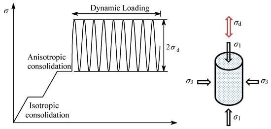 The stress control adopted in the test was divided into three parts: isotropic consolidation, eccentric consolidation, and cyclic loading, as shown in Figure 2. During the cyclic loading stage, a sinusoidal waveform was used to simulate the unidirectional pulse vibration of aircraft loading. To consider permanent deformation of subgrade soil under different degrees of compactness, the test was set to the drainage condition, the number of cyclic loading n was set to 10,000, and compactness K can be calculated according to Equation (1):