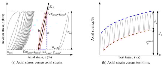 According to Idriss [], the parameter was introduced to study the relationship between the elastic modulus and the axial cumulative strain ratio. is defined as the ratio of the elastic modulus to the initial elastic modulus under a certain cycle vibration and can be calculated according to the following Equation (9):