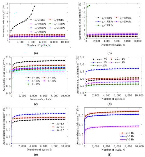 Accumulated axial strain under different test conditions. (a) Accumulated axial strain versus number of loading cycles under different confining pressures. (b) Accumulated axial strain versus number of loading cycles under different loading amplitudes. (c) Accumulated axial strain versus number of loading cycles under different (d) Accumulated axial strain versus number of loading cycles under different loading frequencies. (e) Accumulated axial strain versus number of loading cycles under different densities,. (f) Accumulated axial strain versus number of loading cycle under different moisture content.