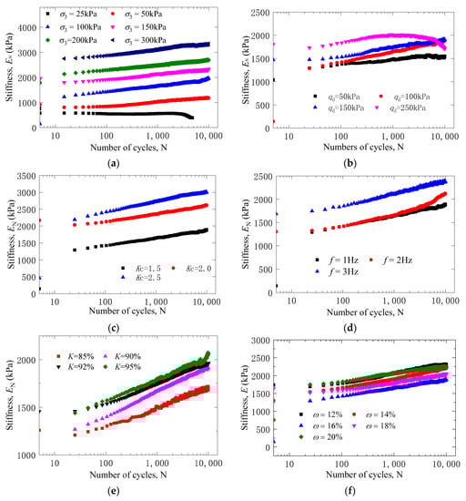 Stiffness under different testing conditions. (a) Stiffness versus number of cyclic loading under different confining pressures. (b) Stiffness versus number of cyclic loading under different loading amplitudes. (c) Stiffness versus number of cyclic loading under different Kc. (d) Stiffness versus number of cyclic loading under different loading frequencies. (e) Stiffness versus number of cyclic loading under different relative densities, K. (f) Stiffness versus number of cyclic loading under different moisture content.