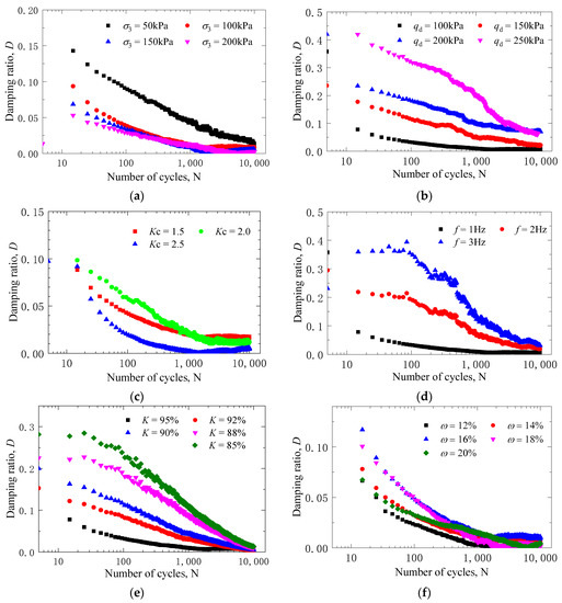 Damping ratio under different test conditions. (a) Damping ratio versus number of cyclic loading under different confining pressures. (b) Damping ratio versus number of cyclic loading under different loading amplitudes. (c) Damping ratio versus number of cyclic loading under different Kc. (d) Damping ratio versus number of cyclic loading under different loading frequencies. (e) Damping ratio versus number of cyclic loading under different densities, K. (f) Damping ratio versus number of cyclic loading under different moisture content.
