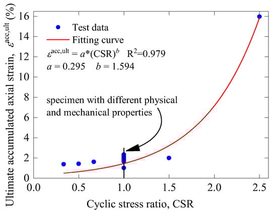 The ultimate accumulated axial strain versus the cyclic stress ratio.