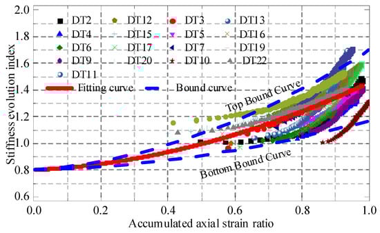 where and represent the elastic modulus and initial elastic modulus, respectively, of a specimen under a certain cyclic loading. Thus, samples with different physical and mechanical properties and cyclic loads can be normalized. Figure 8 shows the relationship between the axial cumulative strain ratio and the elastic modulus growth ratio of different specimens. All data points occur within a specific range, and the best fit curve and the upper and lower envelope can be determined according to Equations (10)–(12):