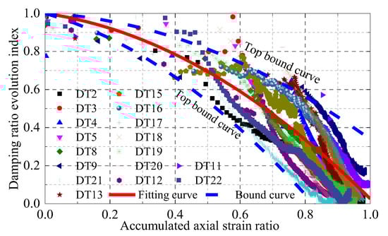 where and refer to the damping ratio and initial damping ratio, respectively, of a sample under a certain cyclic loading. The normalized analysis of specimens with different physical and mechanical properties and cyclic load is conducted as shown in Figure 9, where the relationship between the axial cumulative strain ratio and the damping ratio evolution parameters of different specimens are shown. With increasing , gradually decreases and the test data points fall within a specific range, such that the best fit curve and the upper and lower envelope can be determined using the following Equations (14)–(16):