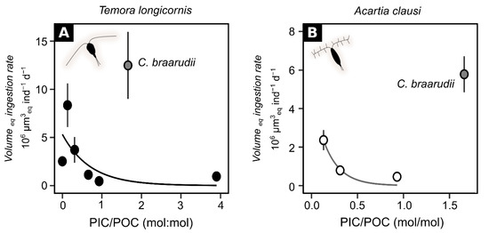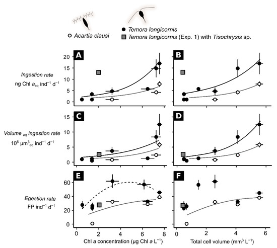 | Total cell volume (mm3 L−1) | Pigment ingestion rate (ng Chl a eq ind−1 d−1) | y = 0.43 e(0.53x) + 0.06 | 0.85 *** | |