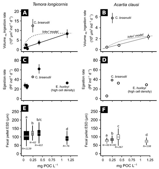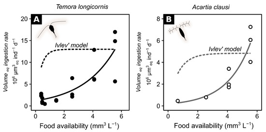 | Volume equivalent ingestion rate (106 µm3 eq ind−1 d−1) | y = 3.02 e(0.29x) − 2.4 | 0.85 *** | ||