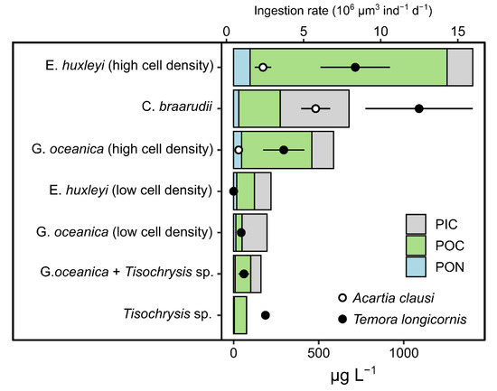 - Harris, R.P.; Paffenhöfer, G.-A. Feeding, growth and reproduction of the marine planktonic copepod Temora longicornis Müller. J. Mar. Biol. Assoc. UK 1976, 56, 675–690. [Google Scholar] [CrossRef]