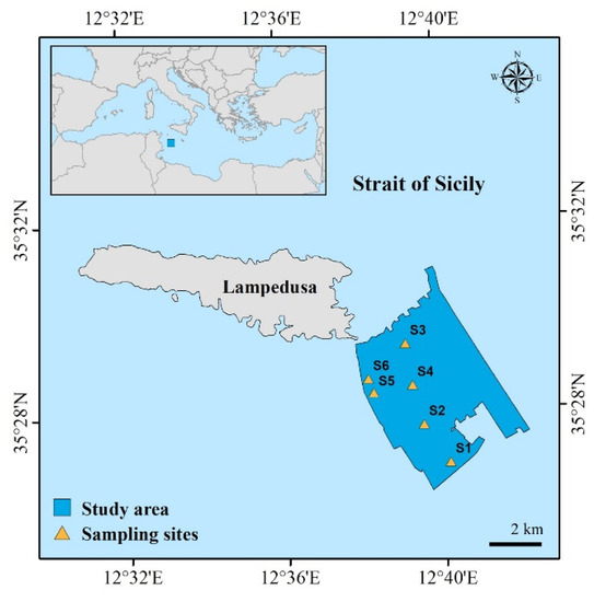 The study area is located in the southeast off Lampedusa Island (Figure 1). It is the largest island of the Pelagian archipelago, located in the Strait of Sicily (Mediterranean Sea). It is entirely made of sedimentary rocks and shows two main sectors: the northern sector, with dominant coastal features varying from steep to sub-vertical cliffs, and the southern sector with the coast gradually sloping down and including several small coves. The south eastern area off Lampedusa is characterized by a coarse to fine sand bottom with P. oceanica meadows as the main habitat close to the coast, followed by sandy seabeds at increasing depth [30].