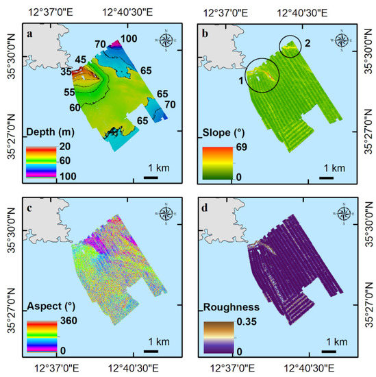 Terrain variables maps from Multibeam morpho-bathymetric surveys: (a) bathymetry map; (b) slope distribution map, in evidence the areas characterized by the presence of high morphologies; (c) aspect distribution map; (d) roughness distribution map.