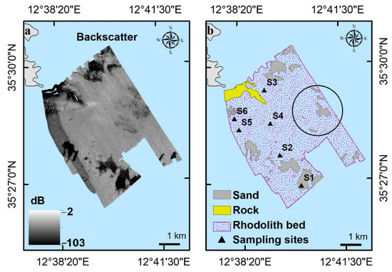 (a) Distribution of the backscatter intensity (sonogram) produced by the multibeam system; (b) simplified classification of sediments in the study area. The circle indicates an area with fewer rhodoliths; sampling sites are also reported.
