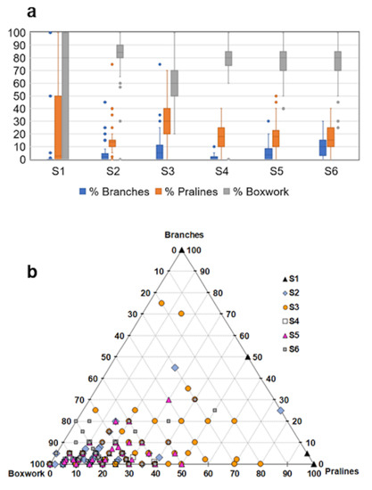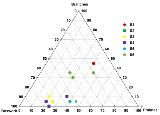 Boxwork was the most represented morphotype in the grab samples, except for the S1 and S6 sampling sites, as is evident in the ternary plot (Figure 8); visual inspection detected a cover of live rhodoliths ranging from 85% to 100%.