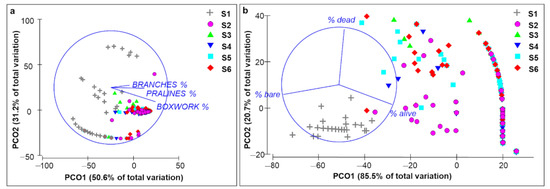 Principal Coordinates Analysis (PCO) ordination plot of the sampling sites related to morphotypes coverage (a) and dead/live ratio (b). Correlation vector is based on Pearson ranking.