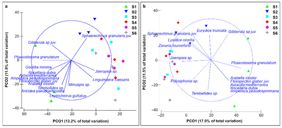 Principal Coordinates Analysis (PCO) ordination plot of the sampling sites related to macrofauna abundances among sampling sites (a) and related to macrofauna and macroflora presence among sampling sites (b). Correlation vector is based on Pearson ranking.