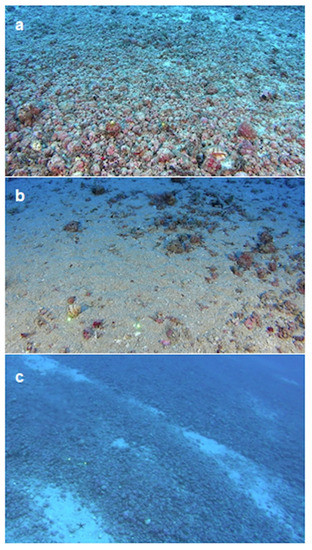 The rhodolith/maërl bed offshore Lampedusa Island is characterized by a rhodolith cover (>87%) higher than other Mediterranean rhodolith/maërl beds, where maximum values vary between ~55–66% in the Tyrrhenian Sea [25,39], ~43% in the Adriatic Sea, and ~66% in the Ionian Sea [40]. Furthermore, it is characterized by high percent coverage of live rhodoliths (not less than 70%) (Figure 10a), and rare sandy patches with low percent coverage of live rhodoliths (Figure 10b), as confirmed by backscatter results (Figure 3b) and videoframes analysis. In some cases, uncovered portions with white fragments of calcareous algae have been recorded; this substrate constitutes the organogenous base of the living rhodolith/maërl bed. This overall scenario highlighted the good health status of the bed, although furrows probably left by trawling were at times detected, suggesting that the area is subjected to anthropic pressures (Figure 10c).