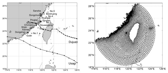 In this paper, strategies for storm over-topping assessment are proposed, and the storm wave processes at the Dazuo Seawall during Typhoon Usagi in 2013 and Typhoon Dujuan [19] in 2015 are studied. These two typhoons were both designated as super typhoons and made landfall on the southeast coast of mainland China in 2013 and 2015, respectively, and their paths are shown in Figure 2.