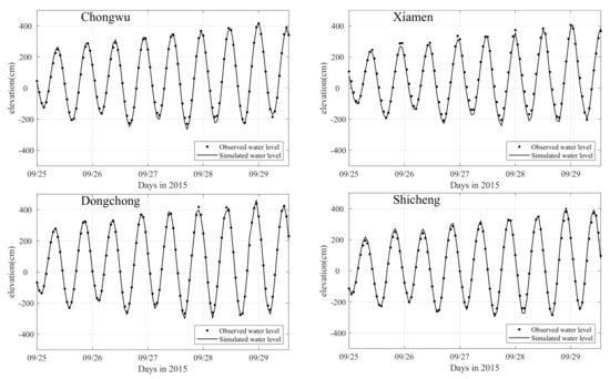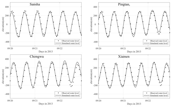 The water level was simulated by FETSWCM-SWAN during the Usagi and Dujuan typhoons, which were influenced by the combination of tide and storm surge. The observed and simulated water levels are shown in Figure 3 and Figure 4, where it is obvious that FETSWCM-SWAN could simulate both the magnitude and phase of the real tide surge. The semi-diurnal tide is predominated in the central and northern parts of the Fujian coast, and the tide simulation has a higher accuracy, whereas the tide is irregular semi-diurnal at the southern Fujian coast, which has a more complex tidal process and is more difficult to simulate accurately.