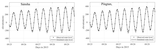Significant waves are simulated by FETSWCM-SWAN during the process of Usagi and Dujuan, which considers the effects of tide and storm surge. The observed and simulated wave values are shown in Figure 5 and Figure 6. The waves exceed 6 m in the central area of the Taiwan Strait, benefiting from the average water depth of 50 m. As the water becomes shallow near the shore, the wave heights decrease to approximately 2 m due to wave deformation and breaking. The waves oscillate in the tidal period at the nearshore area as a result of being affected by tides. The FETSWCM-SWAN model incorporates the effect of tidal current and tidal water level on wave action, which leads to agreement between the wave simulation and observations.