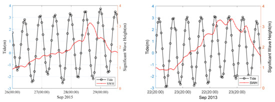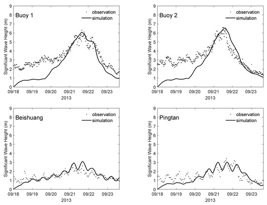 The nearshore wave observations showed obvious tidal periodic oscillation, which was considered an effect of tidal action. The FETSWCM-SWAN model incorporates such wave–tide interactions. Therefore, the simulation results are in good agreement with the observations.