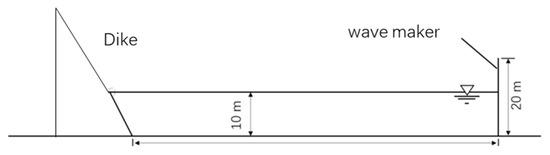 Water runs up at the seawall by the action of waves, and the wave run-up height is measured relative to the still sea water level. The simulation of wave run-up is complicated, as it involves fluid–structure interactions. According to the size and real sea conditions around Dazuo Seawall, an SPH numerical flume with a stepped slope is designed, as shown in Figure 7. The flume is 200 m in length and 20 m in height, and the water depth is 10 m. On the left side of the flume is the seawall with steps at a slope of 55°, which is 9.95 m in total height considering the vertical wall on the top. The left side of the flume is the wavemaker.