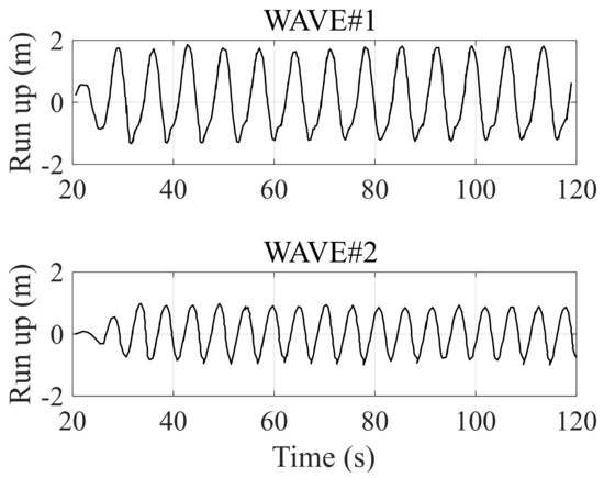 Wave run-up time series of regular Wave#1 and Wave#2.