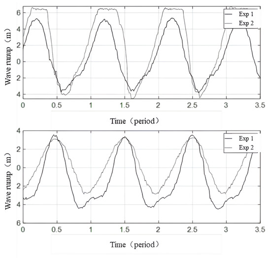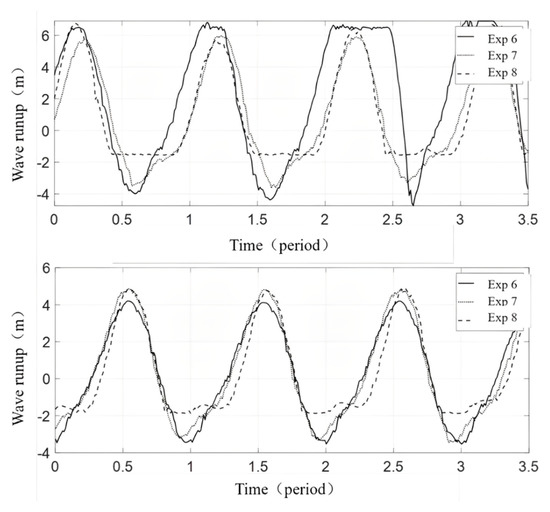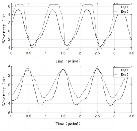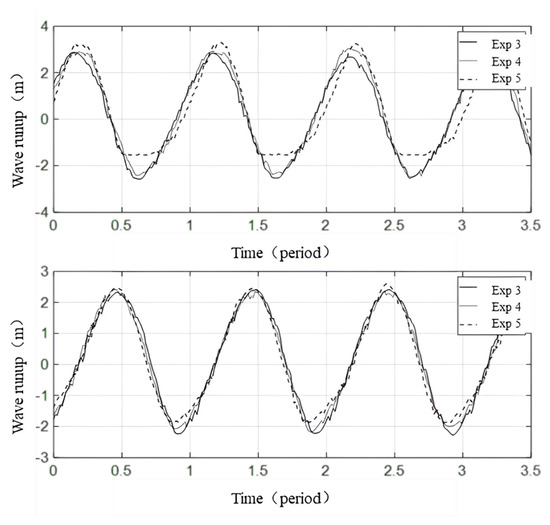 The time series of the wave run-up of Exp 1 and 2 are shown in Figure 11, those of Exp 3 and 5 are shown in Figure 12, and those of Exp 6 and 7 are shown in Figure 13.