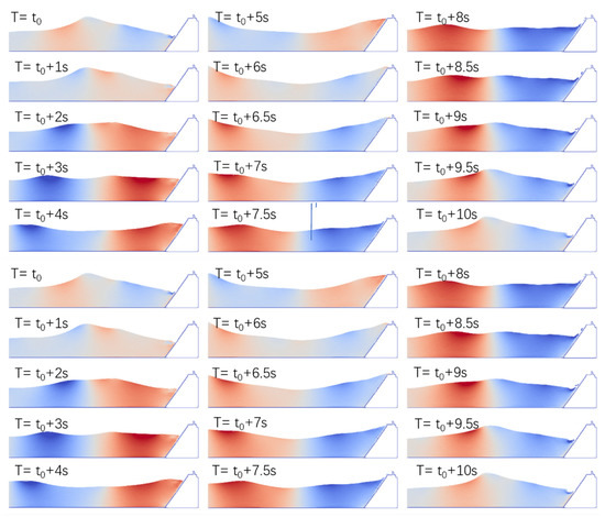 Figure 14 shows different points in time during the wave run-up for Exp 2 of Typhoon Usagi at Dazuo Seawall. Water climbs to the top of the seawall and reaches the vertical wall. With the blocking of the vertical wall, during high tide and under the action of large waves, water can climb to the top of the slope of the seawall, but it is not carried over the barrier.