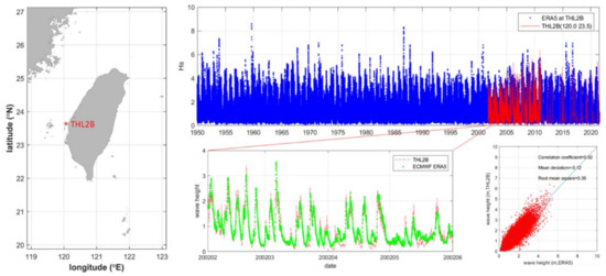 - The validation results based on the reference period (1980–2004) are best in the west and south of Taiwan, where the correlation coefficients are up to 0.78–0.90. This difference is caused by the different travel times of the wave energy to local areas and the island shielding effect.
