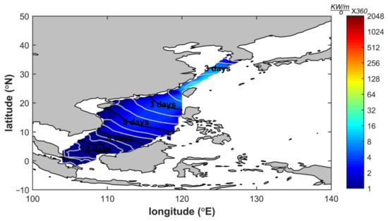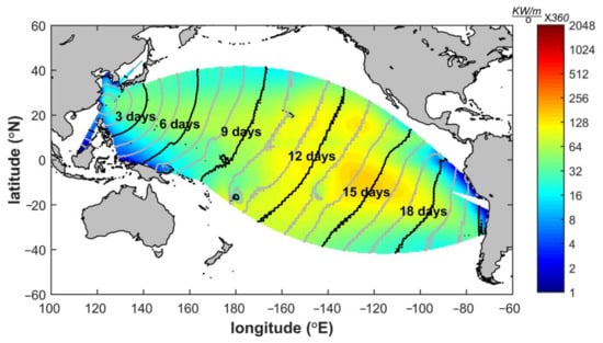 With the aid of the reference period, a statistical model based on the atmospheric predictor from 1980 to 2004 could be built. In the second step in Figure 1, ESTELA was used to find the generation area and the travel time to the swell’s specific location. Figure 3 and Figure 4 depict the results for the east and west of Taiwan, respectively. The energy in the west of Taiwan is low and does not affect the results directly. The high-energy area is located from 20° S to 10° N and 100° W to 160° W, for which the travel time to reach Taiwan is approximately 12 to 18 days. The predictor and its spatial domain are defined in the daily scale by averaging with the previous 18 days from 20° N to 40° N and 100° E to 170° E to include the information on the propagation processes. The settings obtained more optimal results after a preliminary test.