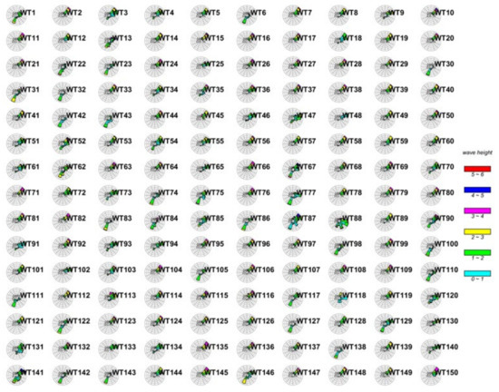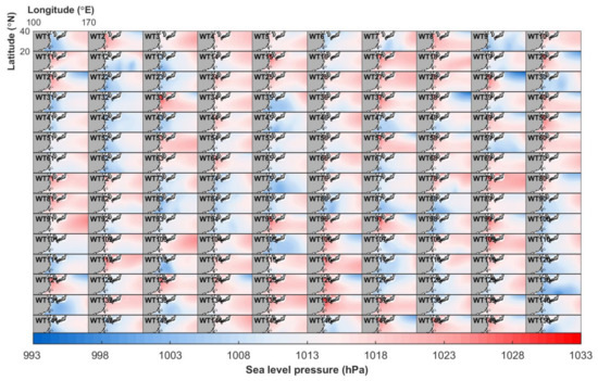 After defining the predictor, the weather-type classification was applied to the atmospheric setting in the Taiwan region using the k-means algorithm. The tests considered various numbers of weather types, ranging from M = 4 to M = 200. The optimal number of weather types was determined to be M = 150. Figure 5 shows 150 weather types (WTs) arranged in a bi-dimensional lattice. Figure 6 shows the bidimensional distribution of and for the 150 WTs at the THL2B site. Figure 7 shows the relationship between the representative atmospheric patterns corresponding to the wave conditions at the THL2B site. We arranged the time series of the wave data from 1980 to 2004 repeatedly within a one-year period and divided the data into five classifications according to the season and wave height. Furthermore, the relationship between the five atmospheric patterns and wave conditions was summarized. When the weather type patterns are greater than 1013 (hPa), it is regarded as a high-pressure system, otherwise, it is a low-pressure system. In storm wave conditions, the spatial difference distribution of the atmospheric patterns of climate patterns is obvious. The low-pressure system in the southwest Pacific, including Taiwan, is shown in Figure 7(A1), and the corresponding wave conditions show that the waves in the north direction are dominant (Figure 7(A2)). In spring, the low-pressure system appears in the South Pacific Ocean. By comparing this with the summer pattern (Figure 7(C1)), the spatial pressure difference in spring (Figure 7(B1)) is not obvious. The corresponding wave conditions indicate that the north wave direction is dominant (Figure 7(B2)). The pressure system patterns of the summer conditions are similar to the storm ones, but the difference between the low-pressure system and the high-pressure system is small (Figure 7(C1)). The main wave direction condition is a southward wave (Figure 7(C2)). In autumn, the North Pacific high-pressure system moved southward, the total area of the high-pressure system increased, and the low-pressure system in the South Pacific decreased (Figure 7(D1)). The main corresponding wave condition is the northward wave (Figure 7(D2)). In winter, the whole southwest Pacific Ocean presents a high-pressure system (Figure 7(E1)), and the main wave conditions are dominated by northward waves (Figure 7(E2)). In Figure 5, several representative atmospheric patterns were observed, such as the low-pressure patterns which are typical of the typhoon period (e.g., WT63 or WT66) and the high-pressure patterns that occur in the northeast monsoon (e.g., WT147 or WT148). From the interannual variability in Figure 8, WT122, WT129, WT142, and WT148 have the highest probability and create a low-pressure system in the region of Taiwan. From the seasonal variability in Figure 8, winter mainly occurs in the patterns of WT147, and WT148, which are covered by high-pressure systems. The climate conditions satisfy those of the northeast monsoon (Figure 6), where the continental high pressure moves south of Taiwan in the winter. Due to Taiwan’s typhoons, a low-pressure system covers the region. Figure 9 (summer) shows that the SLP patterns concentrate on WT6, WT23, WT122, WT142, and WT143, while Figure 6 shows they are all in the direction of southwest monsoon waves, matching the climate at the THL2B site.
