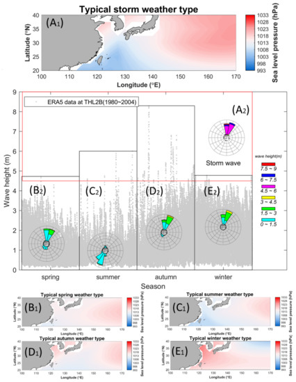 Relationship between the representative atmospheric patterns corresponding to the wave conditions at the THL2B site. (Different weather types are (A) storm, (B) spring, (C) summer, (D) autumn and (E) winter. Subscripts are (1) weather type pattern and (2) corresponded wave rose diagram).