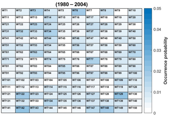 Occurrence probability of 150 weather types for the reference period from 1980 to 2004.