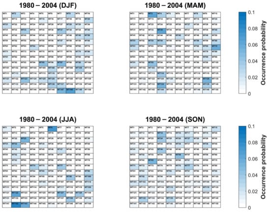 Seasonal occurrence probability of 150 weather types for the reference period from 1980 to 2004.