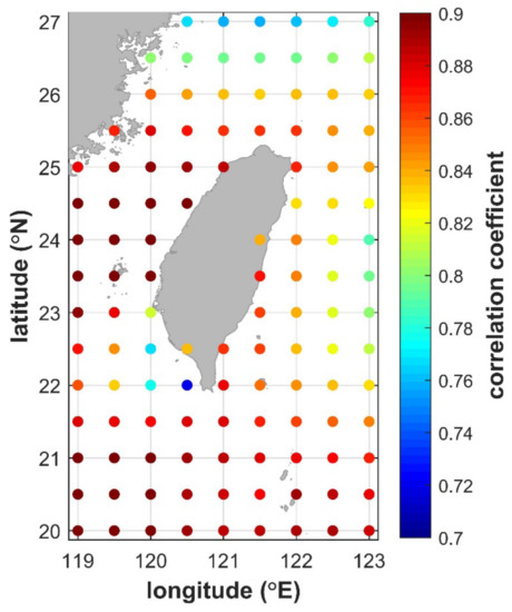 Results of the validation in terms of correlation coefficients. The spatial domain spans from 20° N to 27° N and 119° E to 123° E.