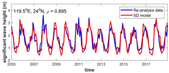 Figure 11 compares the SD model with the reanalysis data in terms of the monthly mean of at 24° N and 120.25° E, where the best performance was obtained (correlation coefficient of 0.87). The SD model results well reproduce the trend of reanalysis data, but the local maxima in winter show visible deviations. The main reason for these deviations is likely the monsoon climate in Taiwan. In winter, the northeast monsoon has a strong wind intensity, making wind waves dominate and swell in a local region. ESTELA assesses the spatial domain of the predictor based on the generation area of the swell. Under this assumption, the results in the winter are underestimated by the quasi-real data with strong wind waves.