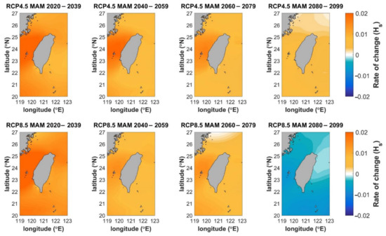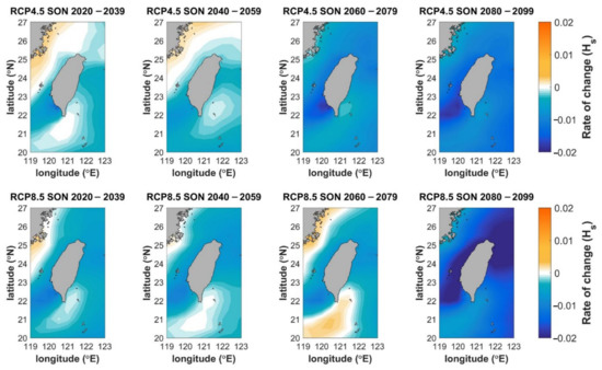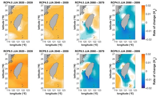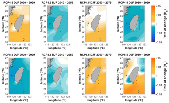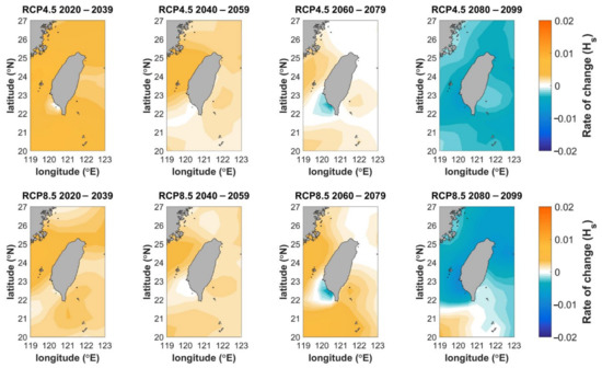 Figure 12 depicts the results of the change rate of around Taiwan for four periods between the RCP4.5 and RCP8.5 scenarios. The spatial minimum, maximum, average, and standard deviation are listed in Table 2. It shows that the change rate of around Taiwan might not be evident from 2020 to 2099, and the change rates of are all less than 1%. Overall, the change of decreases with the increase in the time for both RCP4.5 and RCP8.5. In both scenarios, the maximum increase and decrease of the are shown in the short-term (2020–2039) and the end-of-century (2080–2099), respectively. The maximum increase in the for RCP4.5 and RCP8.5 are 0.84% and 0.44%, respectively. In addition, the maximum decrease of (−0.92%) is shown in the future period (2080–2099) under RCP8.5. On the other hand, the standard deviation shows completely different results at the end-of-century (2080–2099). The change of in the RCP4.5 is uniform, yet nonuniform in the RCP8.5. It should be noted that only minimal changes nearby Taiwan and the value of the wave climatic difference are close to zero, and that is consistent with the ensemble results published by Hemer et al. (2013).