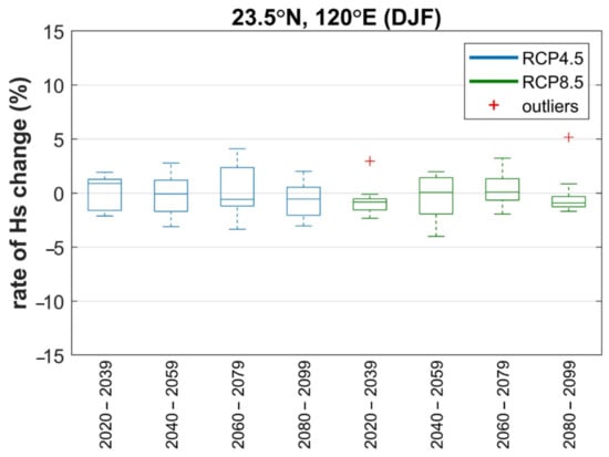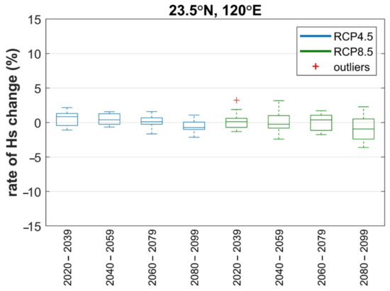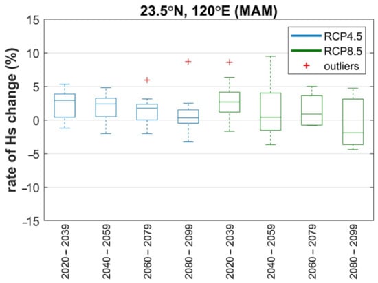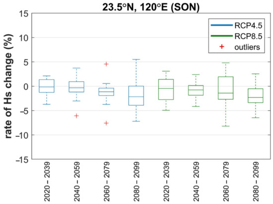 The resolution depends on the historical database used for the reference. The climate in Taiwan has significant seasonal influence, especially northeast monsoons in winter and typhoons in the summer and autumn. Hence, the seasonal changes are taken into consideration in the current study. The changes in the winter wave climate gradually increase with time for RCP8.5, as depicted in Figure 14, which is more regular than the corresponding change for RCP4.5. The RCP4.5 scenario prediction results in Figure 15 are quite varied across the GCMs, while those for RCP8.5 are relatively consistent. In summer, the changes in the wave climate are more consistent than in the winter, and the trend of the wave climate is mainly incremental in the short-term (2020 to 2039) period and decreases with time, as shown in Figure 16. Figure 17 shows that the divergence in the GCM model prediction results is higher in the summer than in winter (Figure 15), and most GCM results show an incremental trend at the observation site. For autumn, the trend of the wave climate change around Taiwan mainly decreased under the two scenarios and decreased with time. The rate of change for RCP8.5 is faster than that for RPC4.5, as shown in Figure 18. In Figure 19, the values in the fourth period under RCP4.5 and RCP8.5 scenarios significantly decrease for most GCMs at the site 24° N, 120.15° E. Finally, the increment change in the wave climate in spring is the largest, but the trend will decrease with time, as shown in Figure 20. In Figure 21, the median rate of change during short-term period increases is about 4%: the largest among all seasons. A comparison of all the seasons indicates that the trend of wave climate changes in the Taiwan area is mainly incremental in the short-term period and decreases with time. The trends of the simulations are more consistent in the spring and autumn, as shown in Figure 15, Figure 17, Figure 19, and Figure 21. Figure 22 shows the near future (short-term period) climate change trend at location (23.5° N, 120° E). The area with the flat coastal line was affected seriously due to climate change in Taiwan. Additionally, overall, the wave climate conditions show an increasing trend during the short-term period. Seasonally, the wave climate conditions tend to weaken in winter, with the largest increase in spring, followed by summer, while the wave climate change in autumn is not obvious.