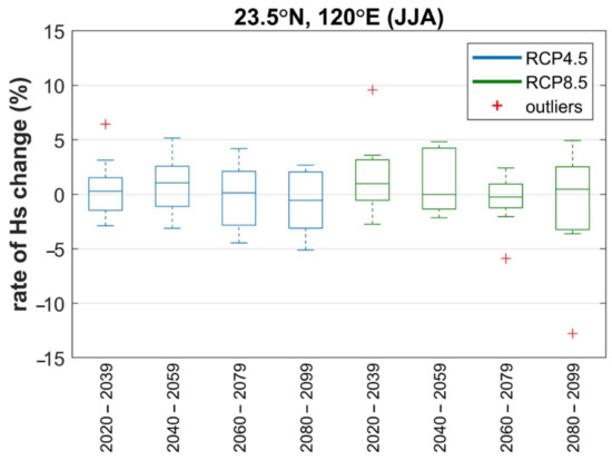 Box plot of rate of change in the seasonal mean of significant wave heights for each GCM, with respect to the reference period from 1980 to 2004 in the region of Taiwan in summer at 23.5° N, 120° E for various future periods (2020–2039, 2040–2059, 2060–2079, and 2080–2099) and scenarios (RCP4.5 and RCP8.5).