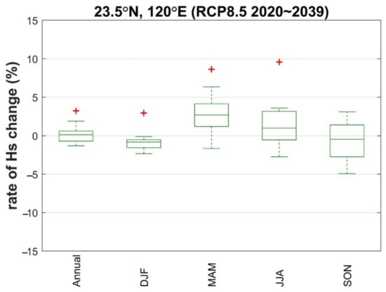 Box plot of rate of change in the seasonal mean of significant wave heights for each GCM, with respect to the reference period from 1980 to 2004 in the region of Taiwan at 23.5° N, 120° E for various future periods (2020–2039) and scenarios (RCP8.5).