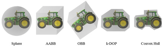A convex hull can cover the object very tightly, but it requires too many calculations. Among the bounding volumes, the most intuitive form is the bounding box, and the improved k-discrete orientation polytope (k-DOP) method is also used extensively. This is a method of cutting out unnecessary parts at each corner in a diagonal direction along with the x, y, and z axes of the existing AABB. In 2D, 8-dop is used to store the maximum and minimum values in four directions, and 14-dop is used in 3D. Collision checking is almost identical to the AABB but in a more extended form. That is, the overlap of each section is checked not only on the existing x, y, and z axes but also on the diagonal axis. Collision is checked by a separating axis theorem. Figure 2 shows an example of applying the five types of bounding volumes described above to a tractor.