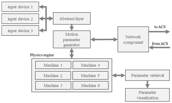 The machine emulator is a module that generates commands to operate equipment for the logic check of the ACS and processes motion control according to signals received from the ACS. The overall structure of the emulator module is shown in Figure 4. Input devices refer to various methods such as joystick, keyboard, mouse, and touch screen. Those devices allow individual machines to be selected and operated for manipulating the drilling works. Signals generated by input devices are converted into basic commands related to movement through an abstract layer. The basic command sets the minimum value to −1 and the maximum value to 1, and the input signal is converted to a value between the two extreme values. This is to ensure that standardized commands are generated for signals from different input devices. A list of operating equipment and basic commands for the motion of the equipment are generated and sent to the motion parameter generator in this process. The motion parameter generator produces actual motion commands by matching the basic commands generated in the abstract layer to the physical specifications of the equipment in the configuration file. The motion commands such as the velocity, acceleration, angular velocity, and angular acceleration are determined at the level of the subsystem that is being manipulated by the input devices. Subsystems may be connected to each other through the hierarchy. For example, a racker has a column installed on the trolley, and three robotic arms are operated individually. Therefore, the final position and posture are calculated by using the velocity and acceleration information from the physics engine to which the dynamic and kinematic constraint is applied so that they can move together by checking the dependency related to the movement. The motion parameter generator sends these positions and attitudes to the ACS core to perform the collision check. Meanwhile, motion parameters and system parameters related to the current operation of the equipment can be checked through parameter visualization. The parameters used in the emulator are summarized in Table 2.