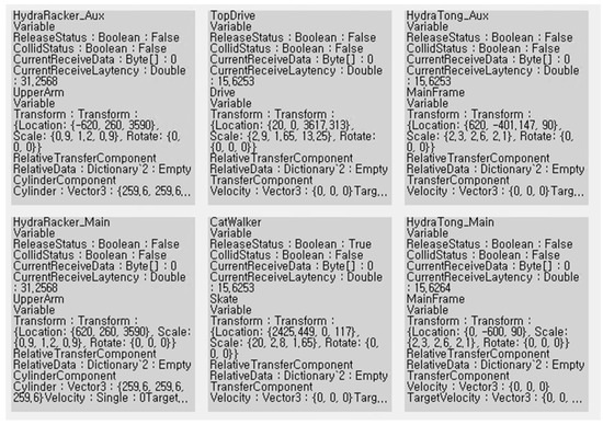In the retrieval unit, parameters are organized into machine name, refreshRate (visualization period), simEvent (event related to simulation such as bypass), and machineEvent (information related to equipment). System parameters include latency indicating communication speed, collision status indicating collision situation, and release state indicating the bypass mode of the device. This organized information is sent to the parameter visualization component and displayed so that the status can be checked by the operator. Figure 5 is an example showing the values of the parameters that the operator can check in the emulator.
